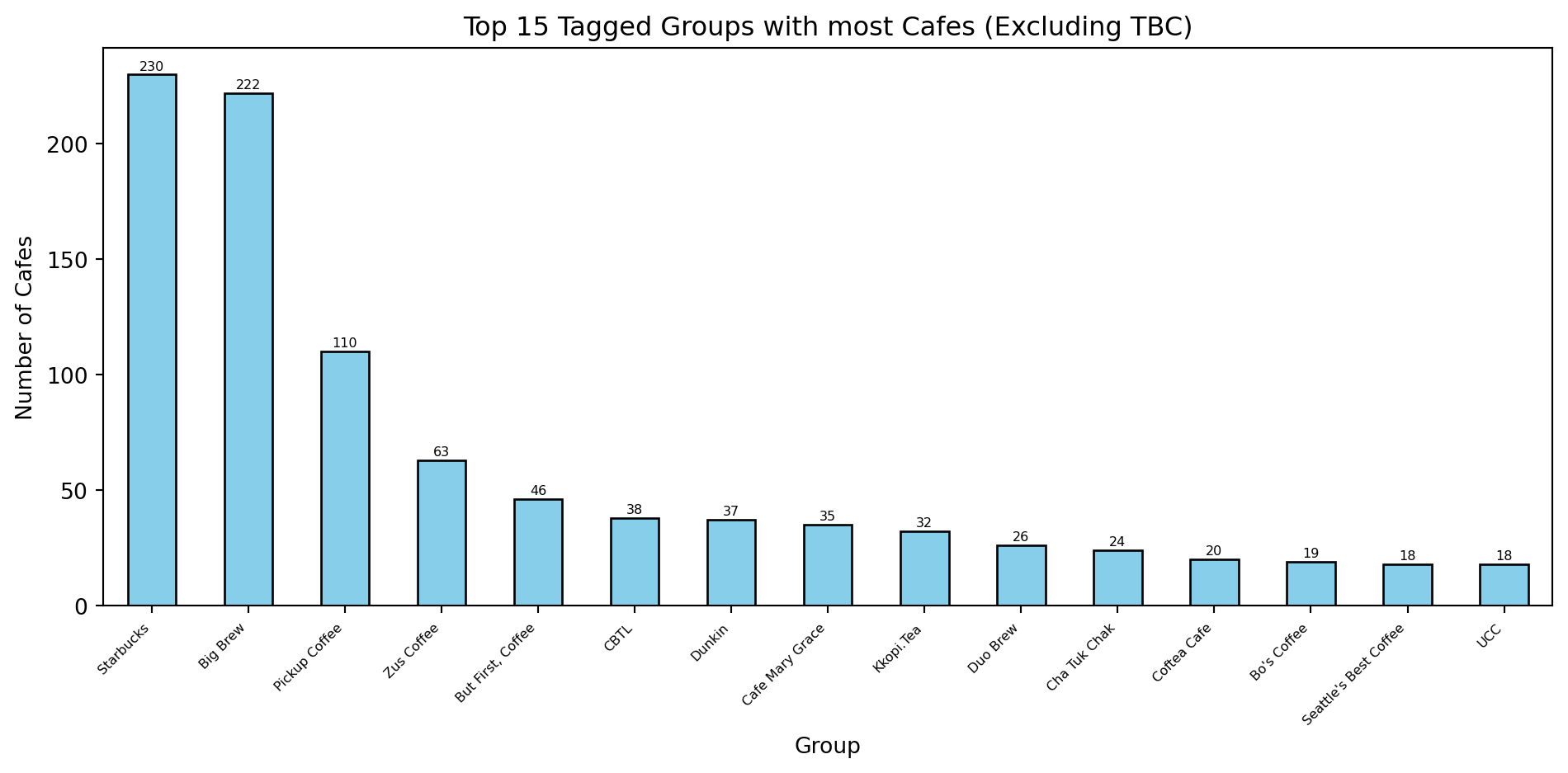 The last data processing step we will cover in this post is the addition of tags to identify cafes that belong to the same name or chain. We created a column Group in the masterfile to capture this information, but assigned a default value of “TBC” for now.