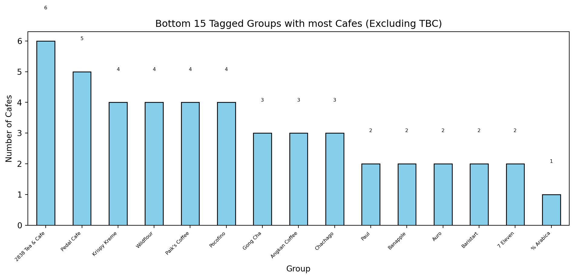 plt.title("Bottom 15 Tagged Groups with most Cafes (Excluding TBC)")