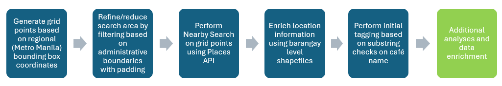 We are able to build an initial database of 6150 cafes in Metro Manila using a straightforward workflow given in the diagram below: