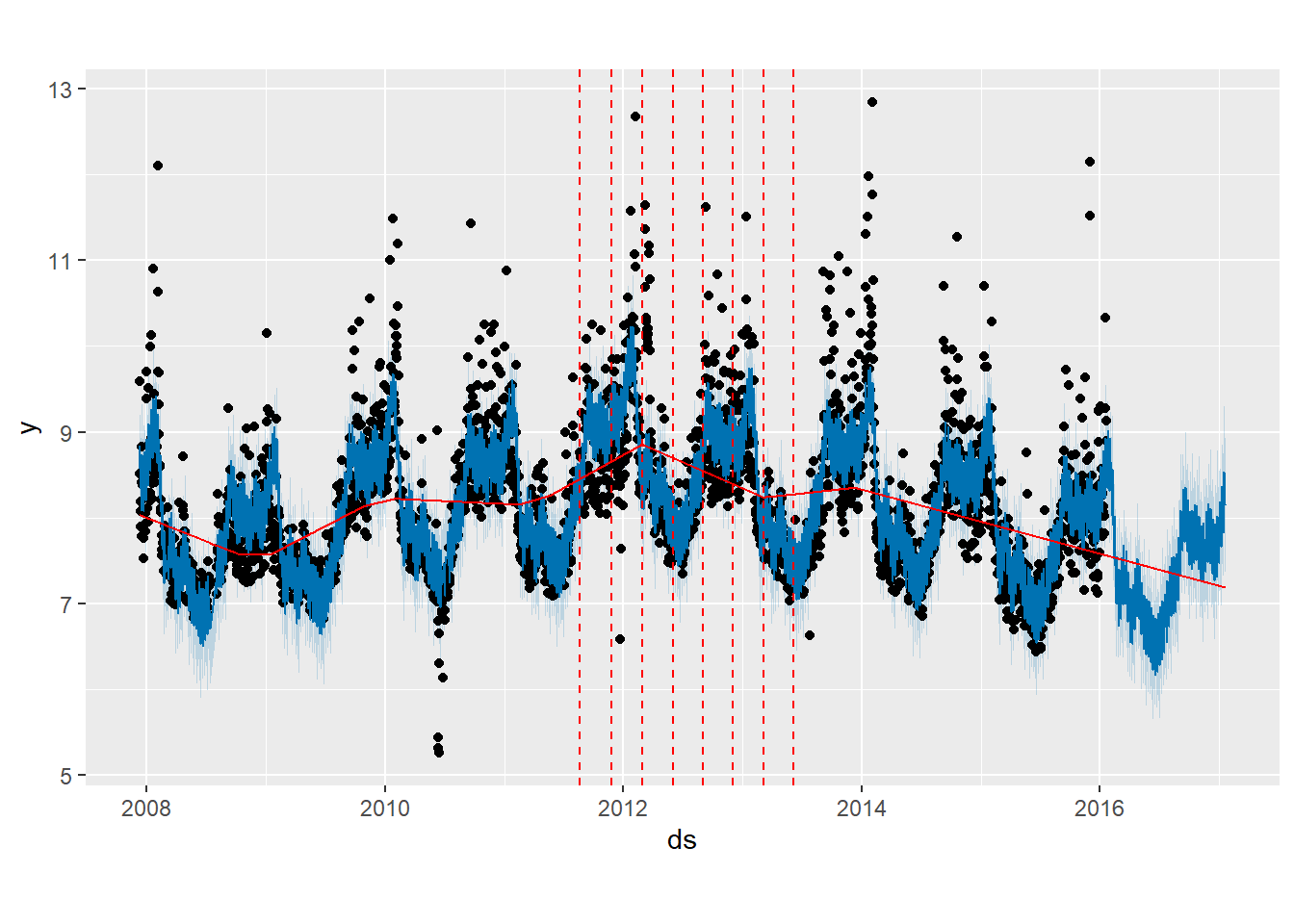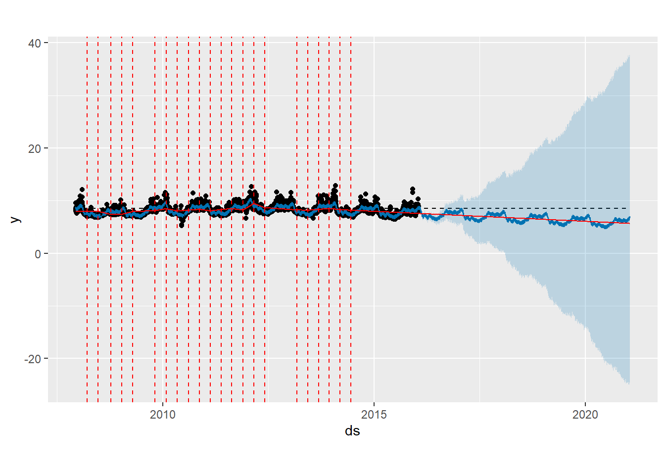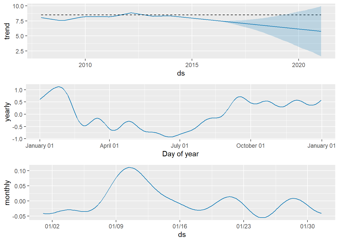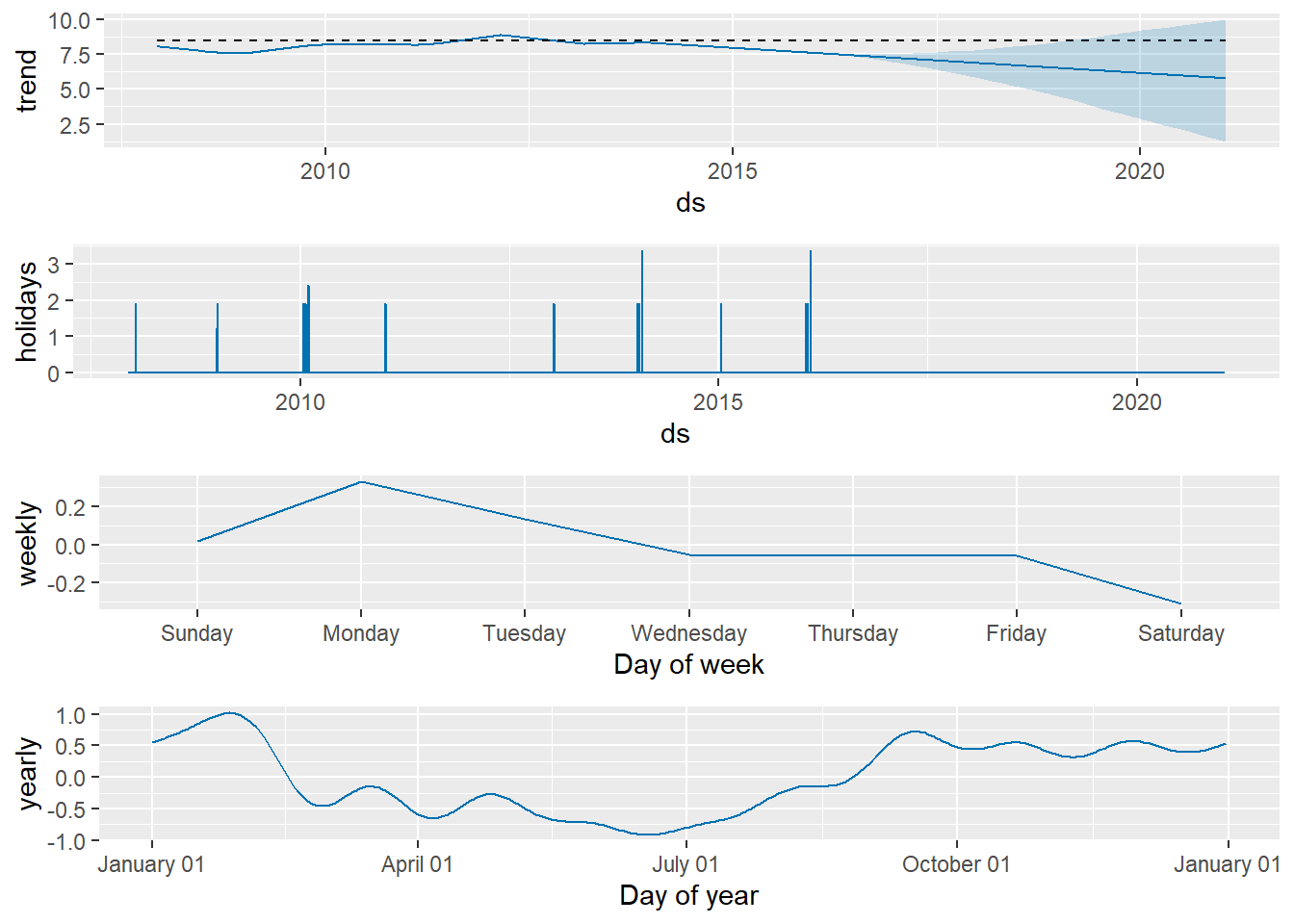 As the post is already long, I will stop here and cover the rest of the documentation in another post. So far, it appears that Prophet is a powerful forecasting package which offers a good amount of flexibility in terms of adjusting the parameters for trend and seasonality, but also to take into account other regressors.