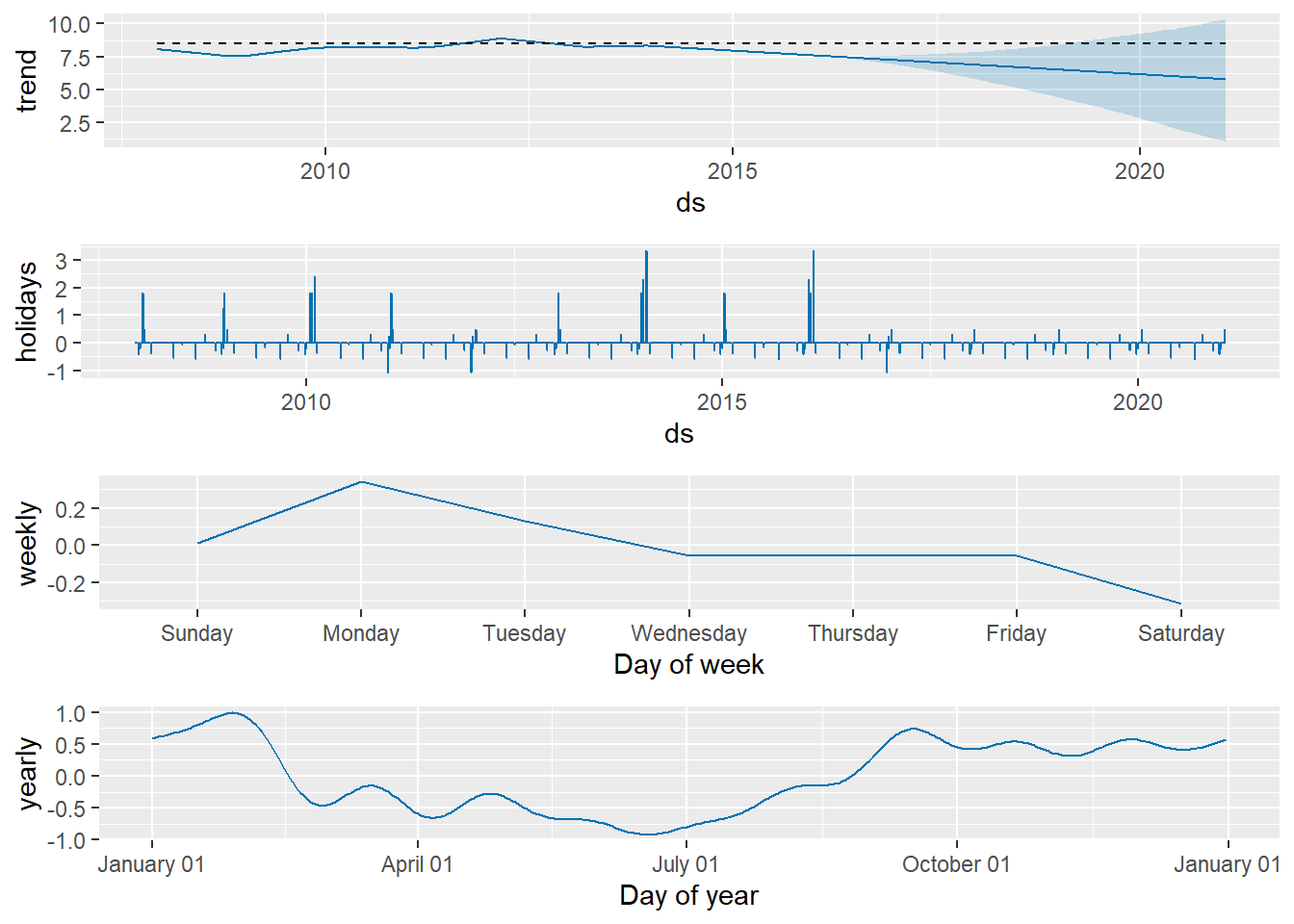 holidays <- bind_rows(playoffs, superbowls)We then rerun the model and pass this dataframe into the holidays parameter.