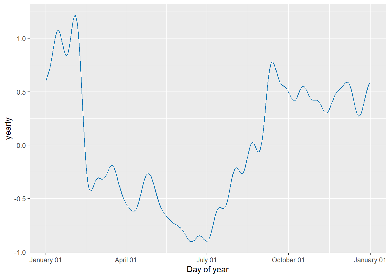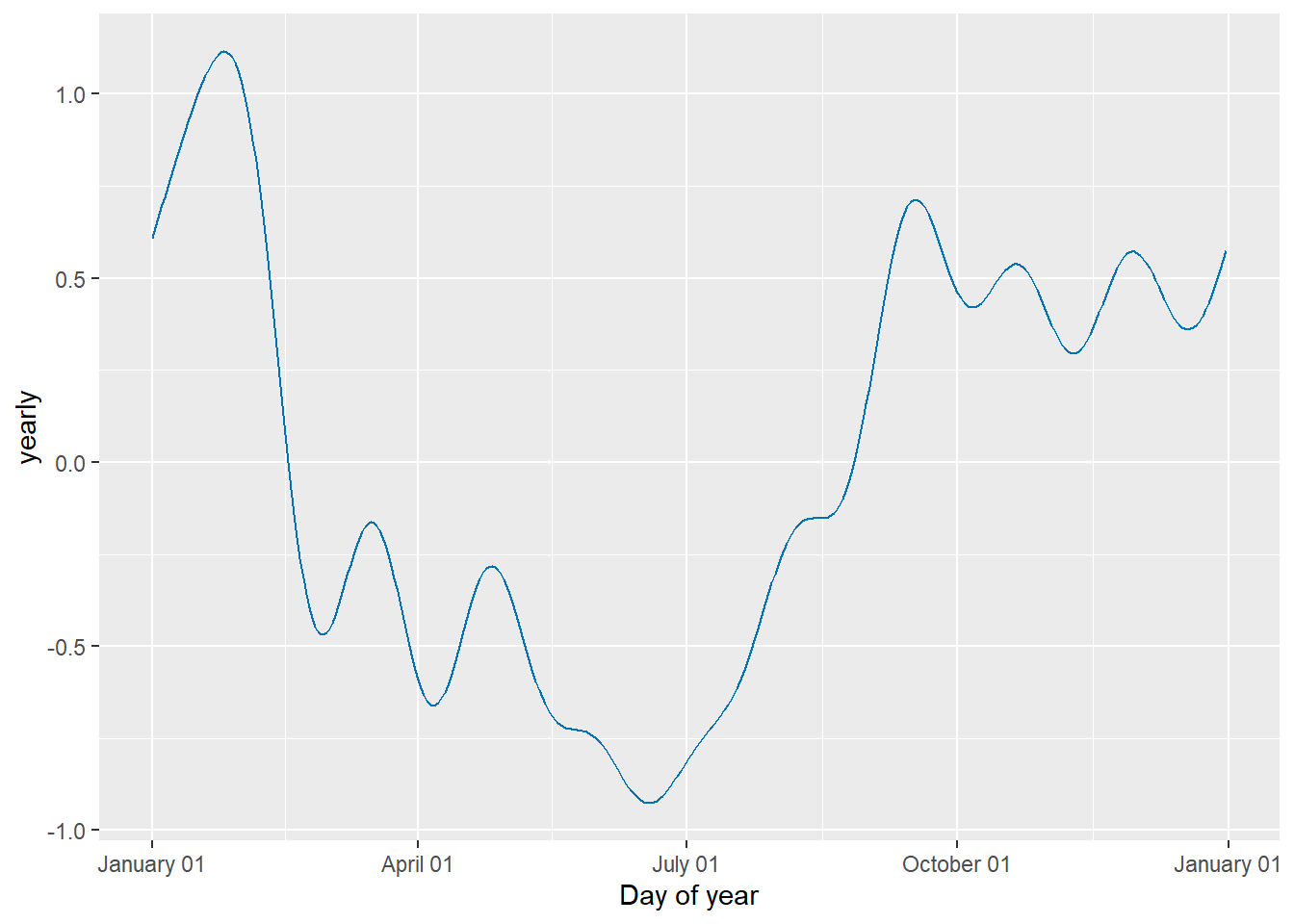 Seasonality is estimated using a partial Fourier sum. The number of terms in the partial sum, or the Fourier order, determines how quickly seasonality can change; for Prophet the default is 10. The following code plots the yearly seasonality using the default parameters.