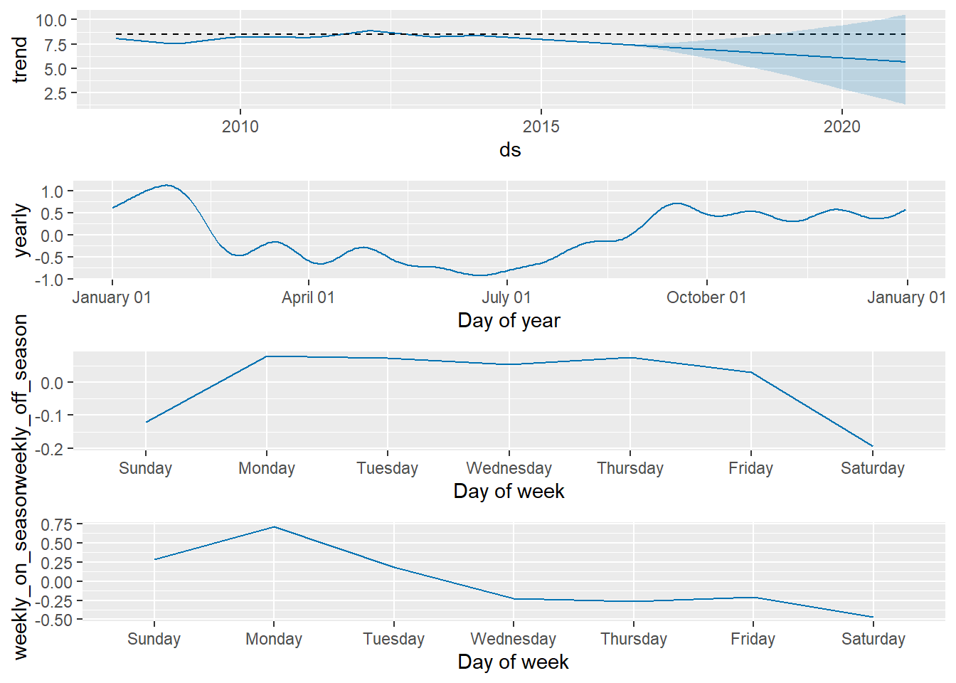m <- prophet(weekly.seasonality=FALSE)We then replace it by adding the two custom seasonalities. These are made conditional through the use of the condition.name parameter.