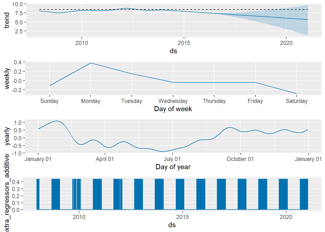 The code below adds an additional column nfl_sunday to identify the effect of Sundays during the NFL season. The effect of this (and any other regressor) will show up in the extra_regressors plot. Note that the same regressor column should be present in the prediction dataframe.