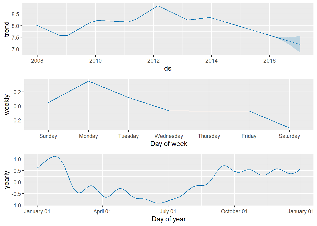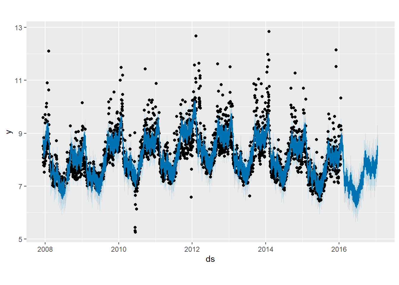 m <- prophet(df, yearly.seasonality = 20)Disabling daily seasonality. Run prophet with daily.seasonality=TRUE to override this.