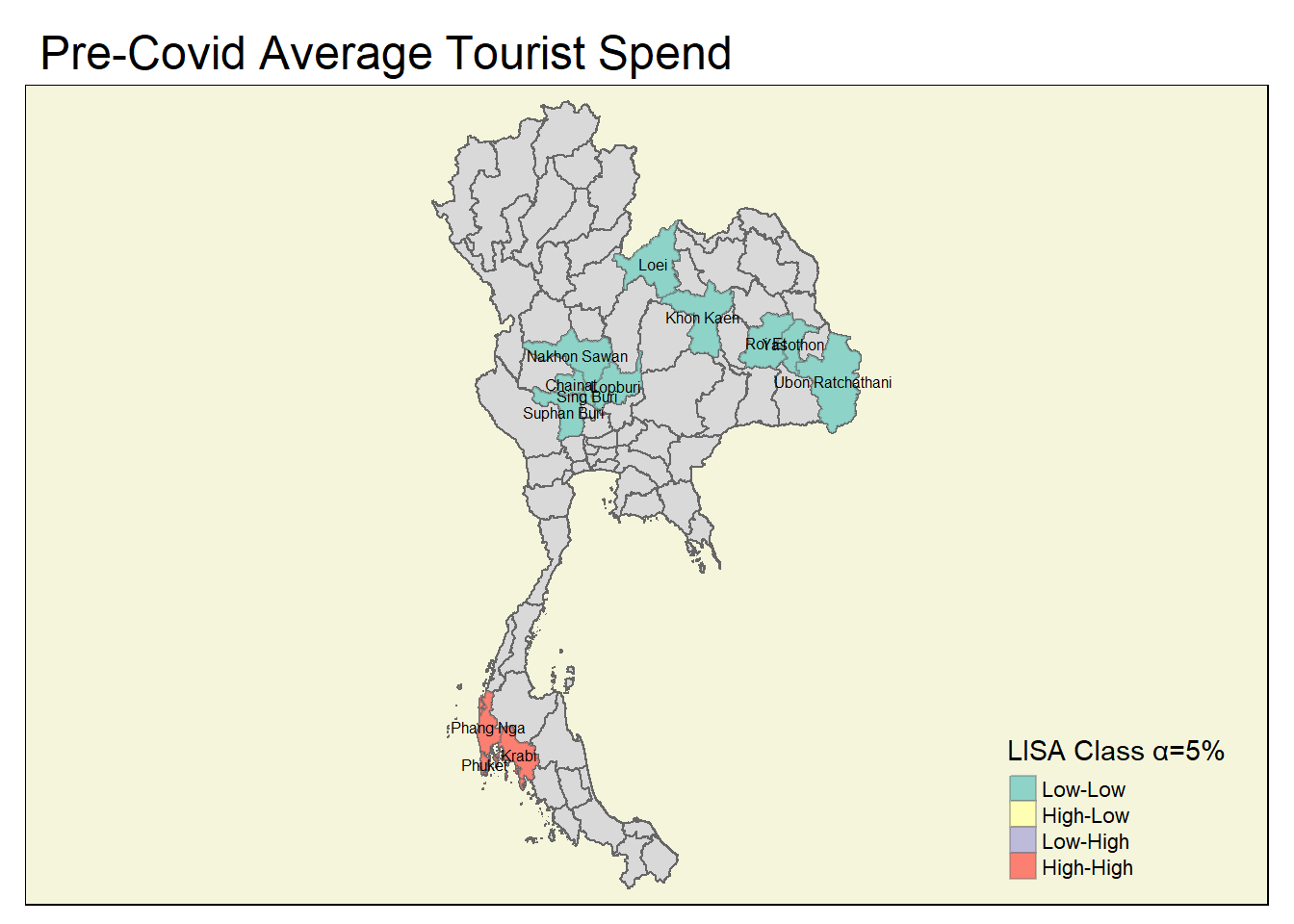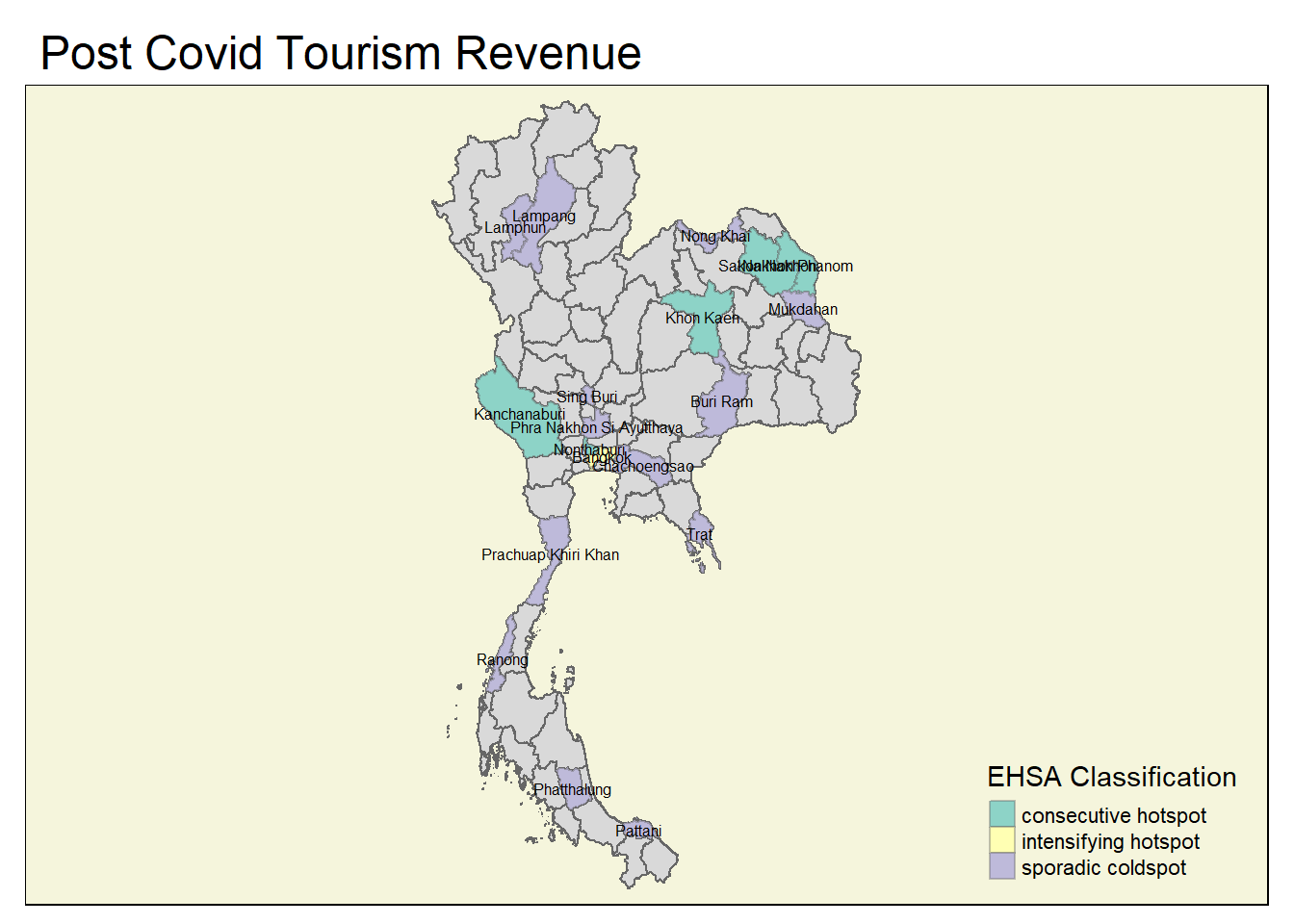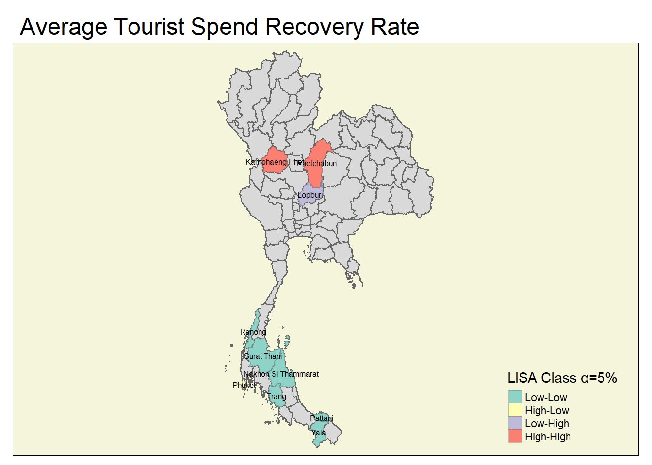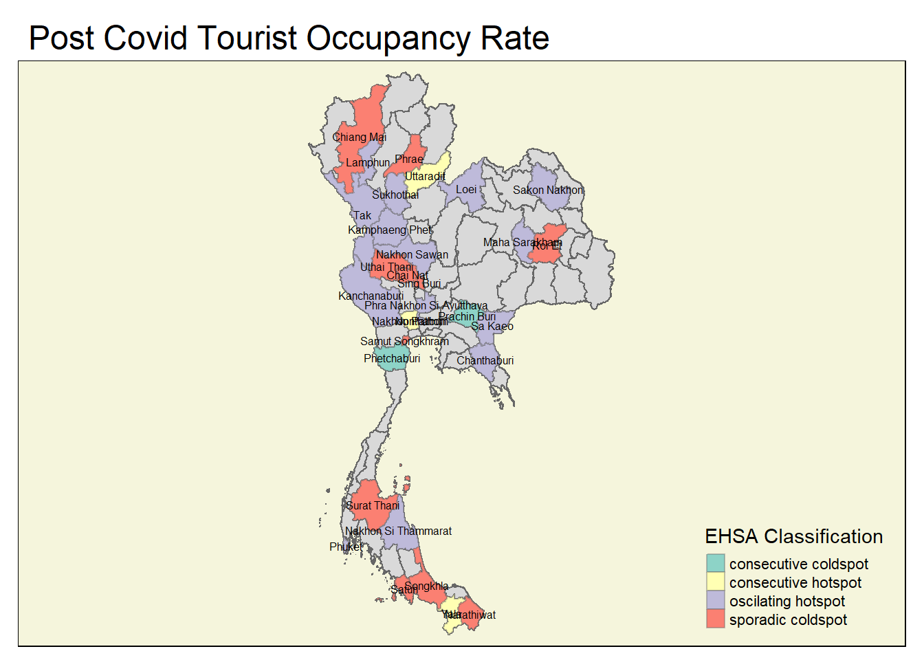 A number of coldspots have been identified specifically for the post-Covid period, and key provinces for tourism among these here need to be identified (e.g., Chiang Mai is appearing as a sporadic coldspot for the occupancy rate)