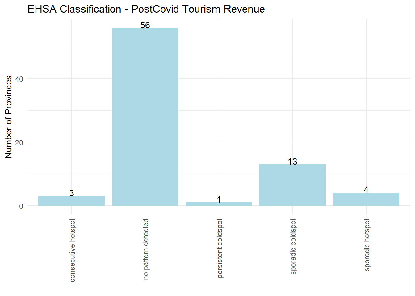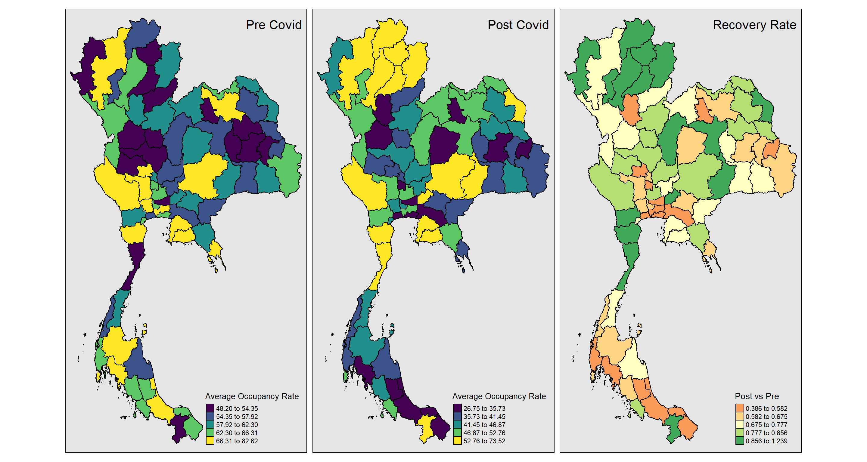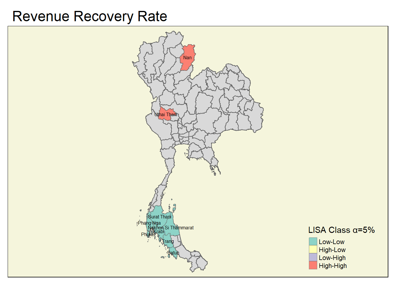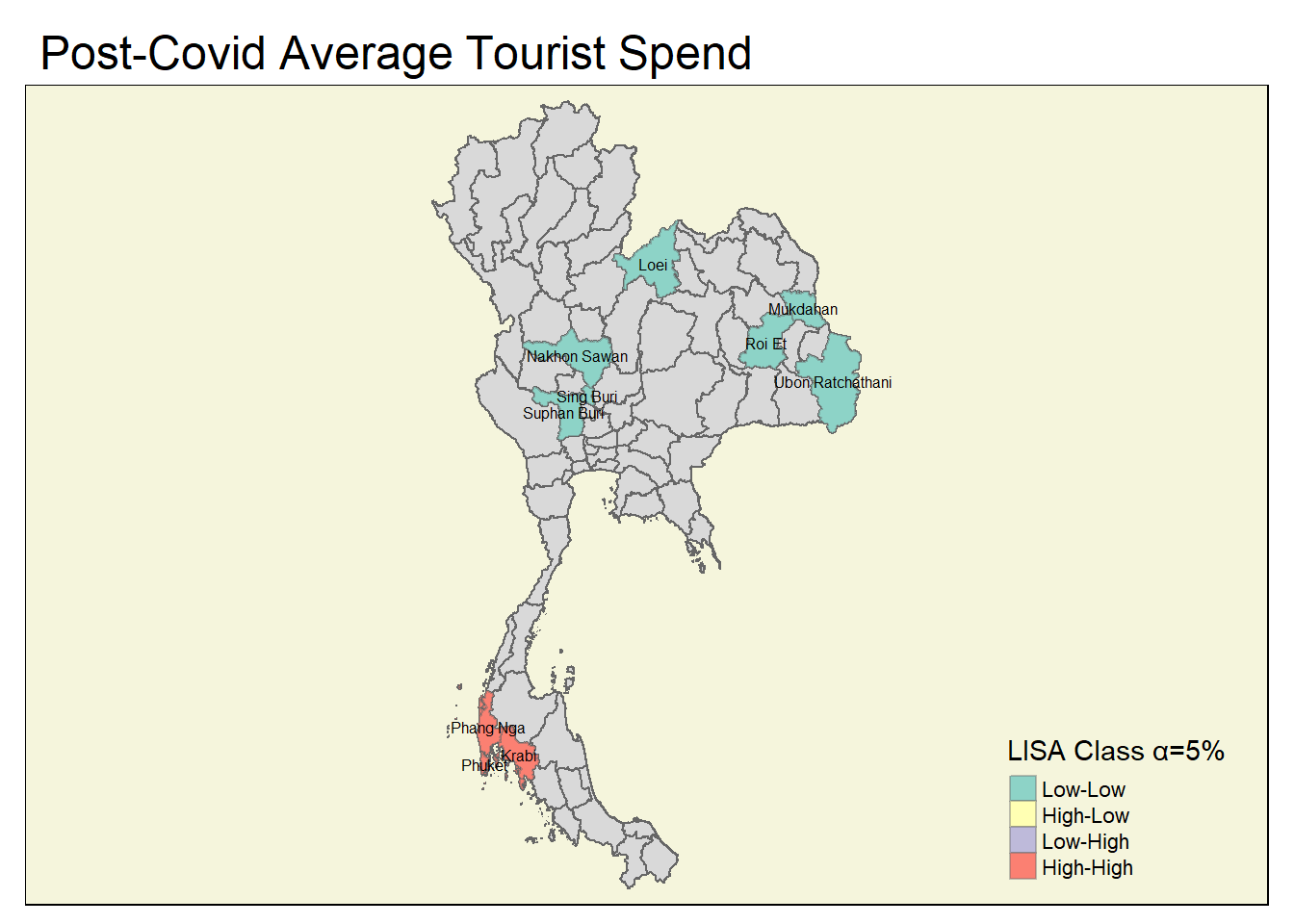 A number of coldspots have been identified specifically for the post-Covid period, and key provinces for tourism among these here need to be identified (e.g., Chiang Mai is appearing as a sporadic coldspot for the occupancy rate)
