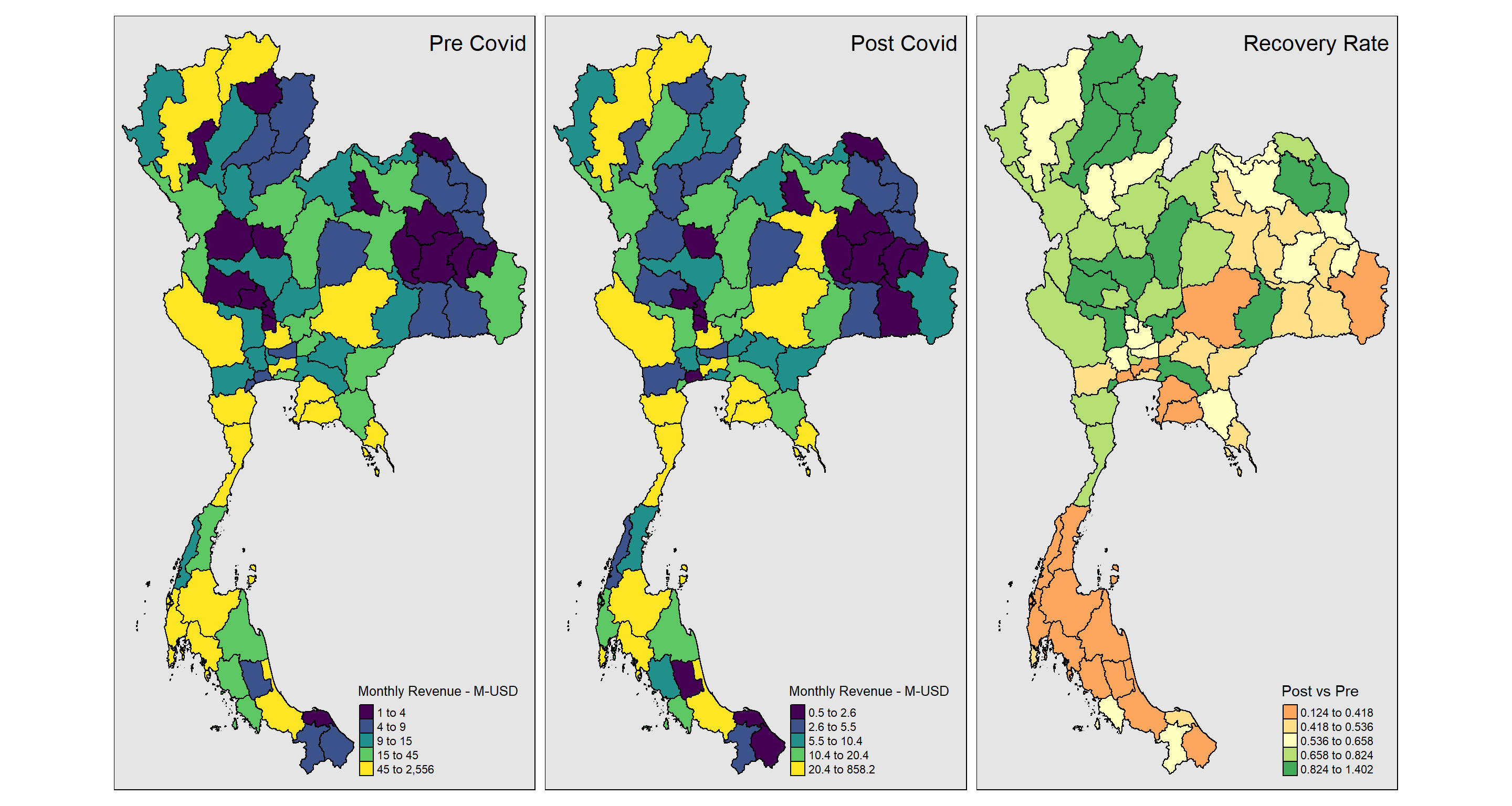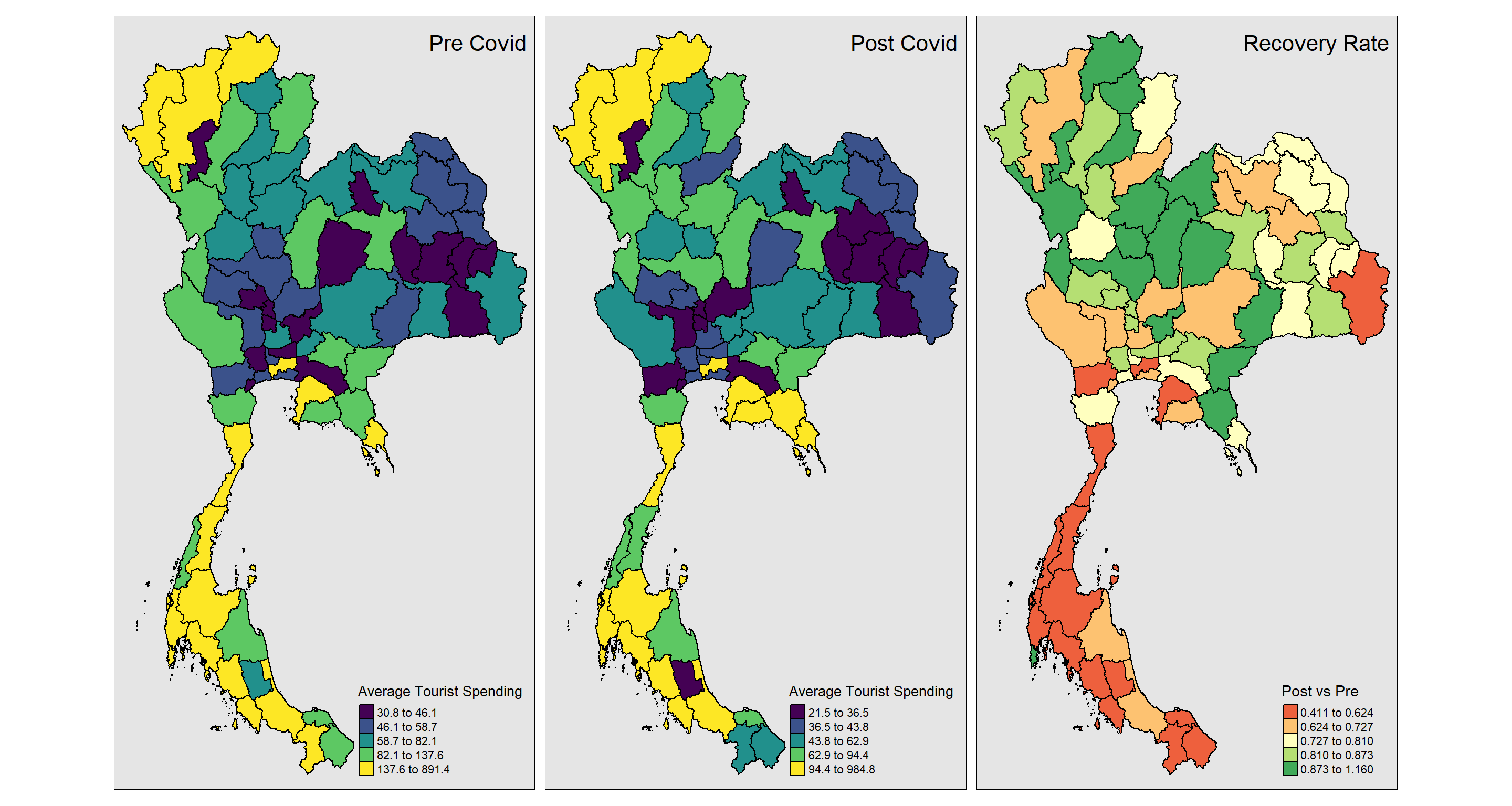 We have conducted various analyses on the tourism indicators across provinces in Thailand. Among the results, policy makers may want to their attention on provinces that are performing worse than the rest of the country, or their neighbors, in terms of performance or recovery.