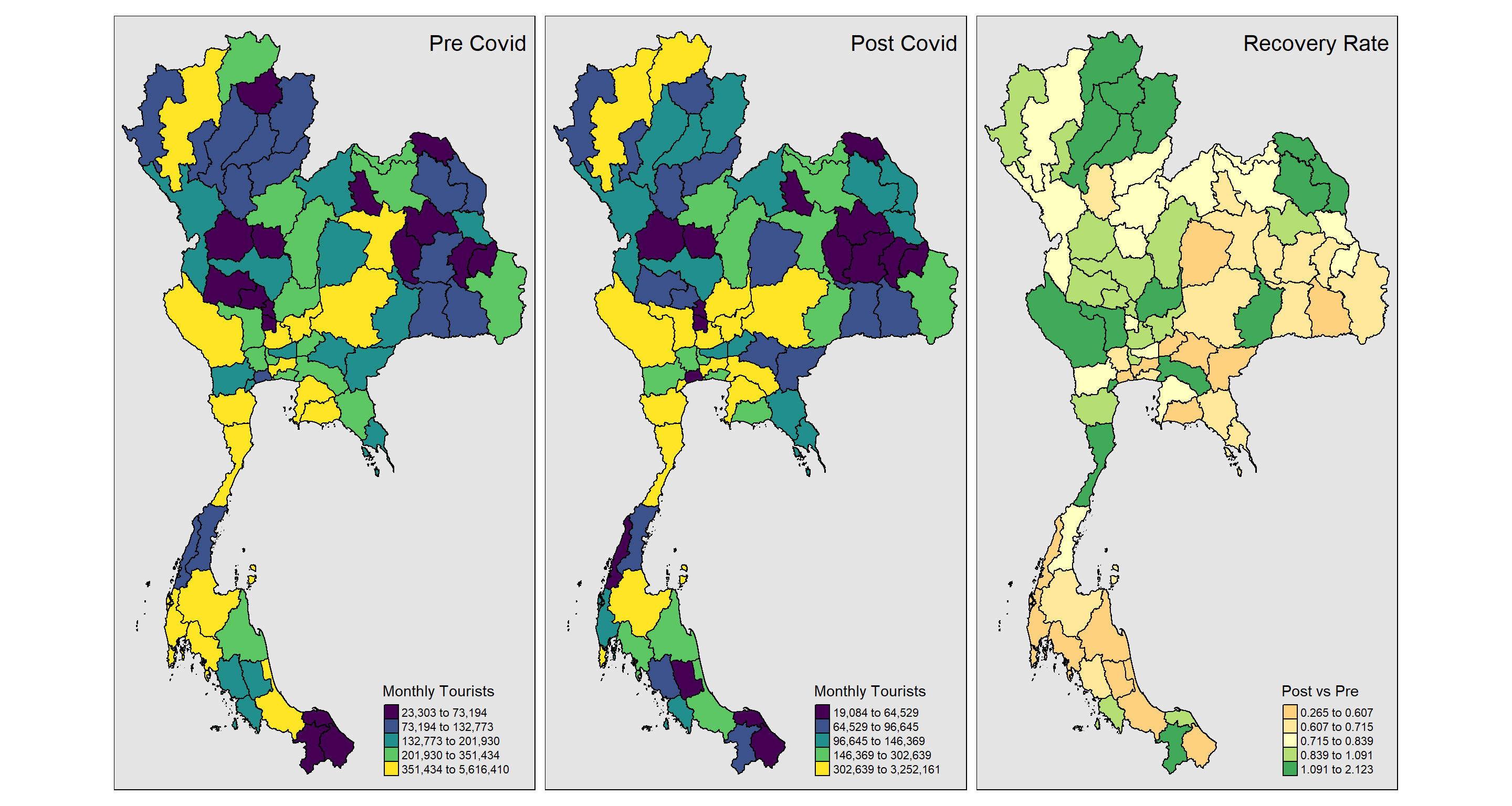 We are interested in understanding the state of tourism across Thailand with regards to its spatial distribution and time and space distribution– both in absolutes and in terms of the trend with respect to the pandemic.