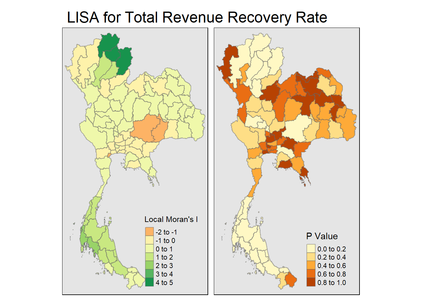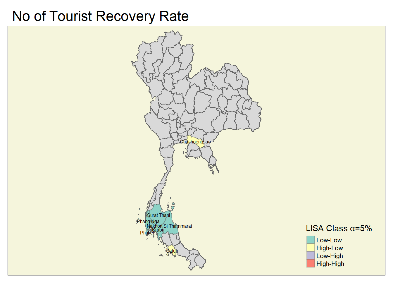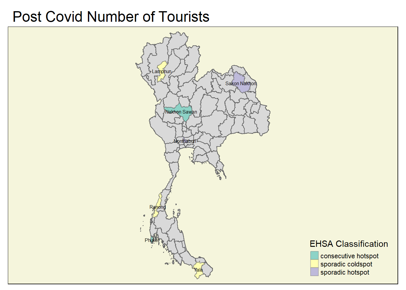 Nonthaburi and Sakon Nakhon are sporadic hotspots, while Lamphun, Ranong and Yala are sporadic coldspots which mean that they have been on-and-off as hot and coldspots for the number of tourists.