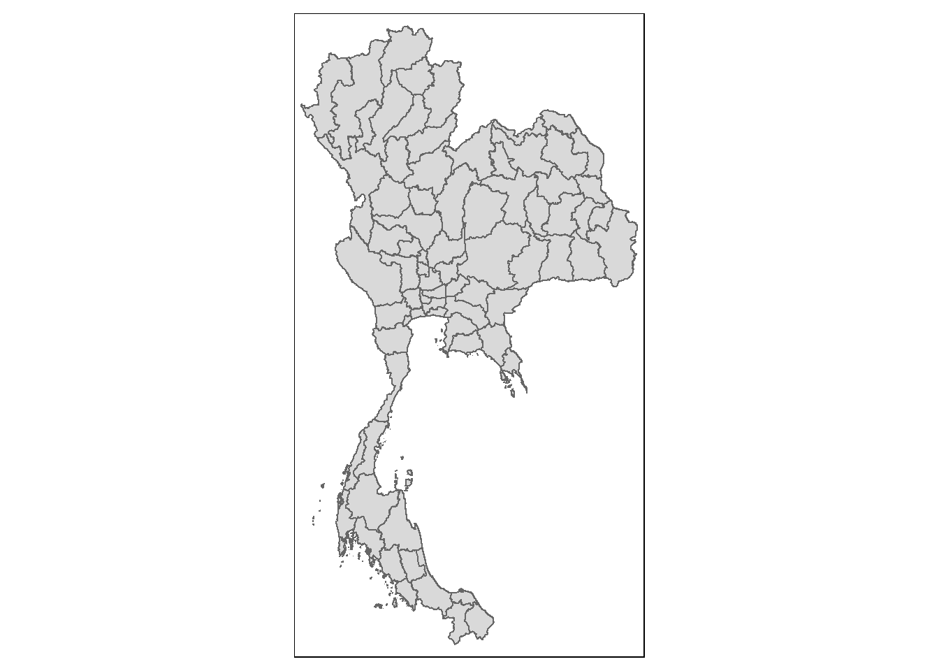 We load the Thailand subnational administrative boundary shapefile into an R dataframe using st_read() from the sf package. We need to analyze at the provincial level so we will be using the files suffixed by “1”.